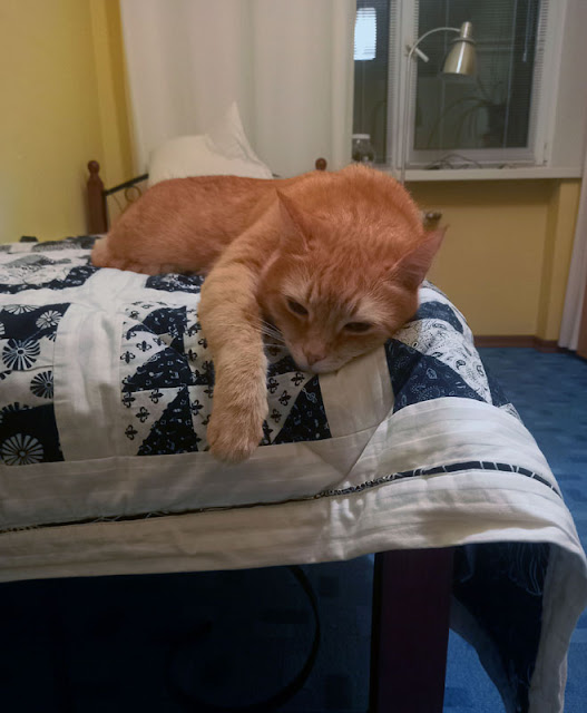 Совсем обленился, почти перестал шалить и безобразничать. Конечно, ночные и утренние тыгыдыки никто не отменял, как и охоту на огонек от лазерной указки. Мурчать он особо никогда не любил, а сейчас и вовсе себе этого не позволяет, а вот оперные арии по-прежнему исполняет виртуозно. Так что основная часть фотографий - это сладкий кошачий сон и отдых. Обыденная такая кошачья жизнь без потрясений и тревог. Иногда только хозяева плохо себя ведут: то уедут куда-нибудь на несколько дней, и приходится животинке ластится к запасному хозяину, то Шебу невкусную купят или овес вовремя не посадят. А однажды, приволокли чужого кота в гости, но об этом расскажу позднее. Места для отдыха все те же. Вот, например, подоконник.